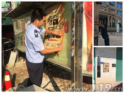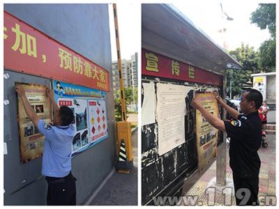 二是张贴海报宣传先行,更重预防。活动中,大队联合派出所发动各种宣传力量在各辖区人员密集场所、出租房楼道、沿街宣传栏张贴《谨防电动车小火酿大祸》等宣传海报,用通俗易懂的语言,从初期火灾、逃生自救、灭火器的使用方法、如何正确的拨打119、110报警电话等方面向围观群众进行宣讲。