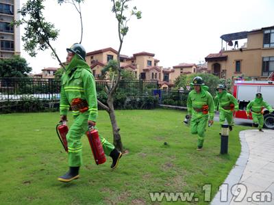 当日上午10时许,假设碧桂园小区85栋一住户家中发生火灾,火势燃烧猛烈,冒出滚滚浓烟。小区物管值班室接到火情报告后,值班人员立即通知小区微型消防站队员赶到现场扑救初期火灾,并拨打了119报警电话。