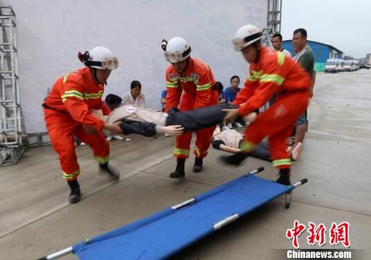参加演习医护人员在转运伤员。 覃庆和 摄