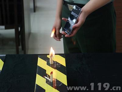 消防员将一根香烟竖立在平面上,烟头朝上,消防员打开激光笔,用激光笔对准烟头,11秒时间,香烟头被点燃!
