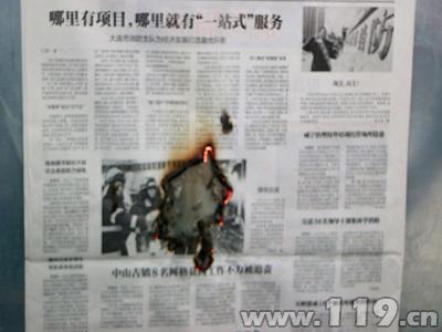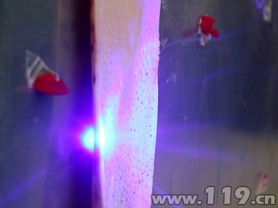 消防员将6层厚报纸张贴在移动黑板上,报纸与桌面呈90度角放置,随后,消防员用激光笔对准报纸正面,仅仅用了12秒时间,激光射穿了6层厚报纸出现一个大洞,射穿处出现了火星,呈焦状。