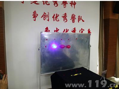 消防员将气球吹大,黏贴在移动黑板上。消防员戴上护眼镜,打开激光笔瞄准气球,气球接触到激光后,只听见“啪啪啪”的声响,气球连环爆破了。