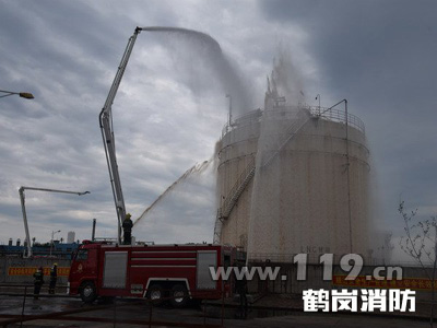 演练地址设在鹤岗市征楠煤化工有限公司,该公司位于鹤岗市工业园区,企业员工420人,占地面积38000㎡,总建筑面积12000㎡,主要生产储存焦炉煤气、冶金焦、煤焦油、硫磺、硫铵、粗笨等。重点部位为粗苯罐区和LNG罐区,此次演练模拟LNG罐区储罐底部进液阀发生泄漏引发火情,LNG储罐位于厂区东侧,罐体北侧有装车泵,如LNG储罐起火就救援不及时会发生爆炸,势必引起整个储存装置连锁反应。