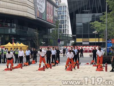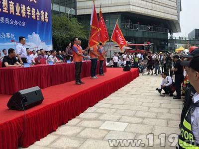 此次演练模拟龙湖天街商务区C栋1号楼因工人装修施工期间电焊火花引燃堆积在房间内的纸箱和塑料保护膜,产生了大量的浓烟和明火,并迅速蔓延扩大,多名人员被困,需紧急疏散。应急救援处置行动按预案进行了巡查报警、先期处置、启动预案、救援推进、火情扑灭、演练评估、应急志愿者授旗仪式等演练科目,圆满完成了演练的预定目标。