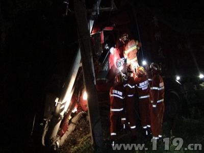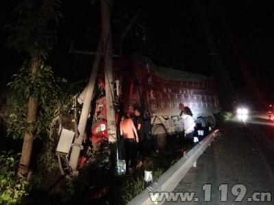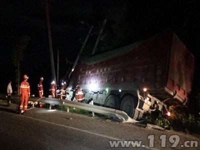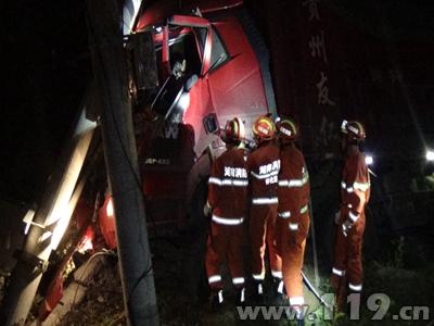 大货车深夜撞向高压电杆司机被困怀化消防及时营救