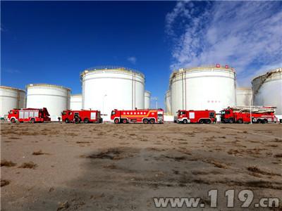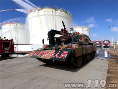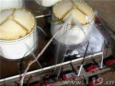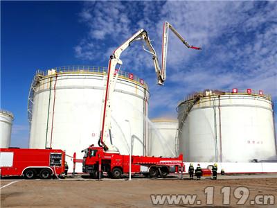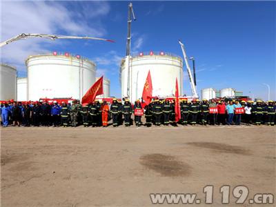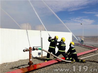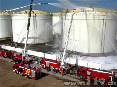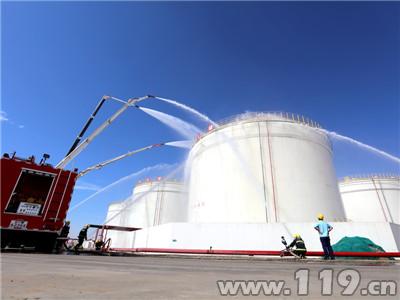 演练假设,中国石油内蒙古乌海销售分公司乌海油库柴油储罐因遭雷击,导致罐顶撕裂发生火灾,单位发现火情后立即拨打119报警,同时启动罐区内的喷淋冷却系统开展自救。
