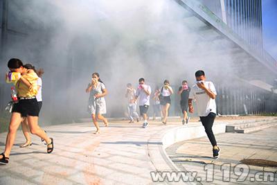 演练假设位于岳池县城东新区站前大道58号某高层办公大楼一楼管道井因电气线路超负荷引发火灾,火势迅速蔓延,建筑一层、二层烟气弥漫,多名群众被困。车站消防控制室接到烟感报警后,工作人员立即调出监控视频,查看报警位置,派人确认,同时启动建筑固定消防设施,并拨打119报警。车站消防控制室值班人员立即启动车站自带消防设施,启动消防水泵对室内管网加压供水。与此同时,车站立即启动灭火疏散预案,车站工作人员组织被困人员佩戴自滤式呼吸器并有序疏散,微型消防站6名义务消防队员赶往现场利用干粉灭火器、室内消火栓阻止火势蔓延。