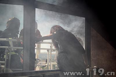 9时13分,经侦检小组侦察发现,火势已通过管道井向上蔓延,火势较大,有大量人员被困,情况十分紧急,侦检小组立即向现场指挥员报告情况。现场指挥部接到报告后,立即向广安市“119”指挥调度中心报告火情,请求增援。支队指挥中心接到增援请求后,迅速调集华蓥市消防大队54米登高平台车、特勤中队32米高喷车、大功率水罐车和迎宾大道中队32米高喷车、大功率水罐车、战勤保障大队压缩空气充填车到场增援。9时15分,火势正通过大楼管道井迅速向上蔓延,现场浓烟滚滚。浓烟已经将一楼、二楼、三楼的疏散通道全部封锁。由于通往一楼的疏散通道被浓烟封锁,之前来不及疏散的2名被困人员正在3楼平台上挥舞着毛巾,呼喊着救命。为防止两名被困人员作出过激行为,消防官兵手持扩音器安抚他们不要采取跳楼的逃生措施,在消防官兵的安抚下,2名被困人员情绪逐渐平稳,耐心等待消防官兵的救援。为及时营救三楼平台被困人员,2名消防官兵登上32米登高平台消防车进行救援,登高平台消防车在消防官兵的操作下徐徐上升,不断地接近被困者所在的三楼平台。3米……2米……1米,登高平台顺利接近三楼平台,火场救援的生命通道被成功打通,2名被困人员被消防官兵成功营救到登高平台。