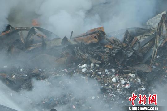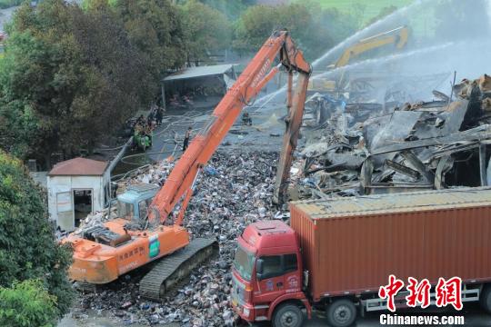 记者登上火场附近一座高层建筑看到,在视线范围内已无明火,起火厂区内被白色烟气笼罩,传出刺鼻味道。十多道水枪喷出的水柱“冲”向火场各个位置,还有七八台挖掘机正对已经烧毁的仓库建筑进行破拆工作。火场地面上,散落着被烧的漆黑的电饭煲及零件,有几处的电饭煲甚至堆积成小“山”。