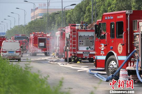 28日下午15时许,记者抵达起火仓库附近。在距离厂区还有两三百米时,便能看到从起火地传出的白色烟气。该仓库门外一侧公路已被封停,十余辆消防车辆排布在马路上参与灭火。