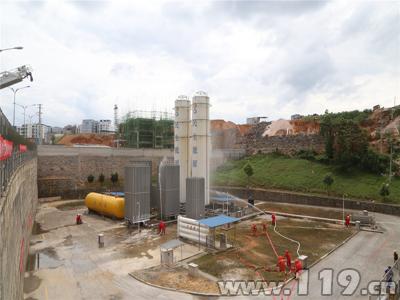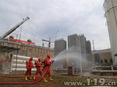 演练假设民生能源储罐区发生泄漏事故,导致一名工作人员昏迷,泄漏气体由于静电作用被点燃,火焰高达10米,情况万分危急。灾情发生后,民生能源公司专职消防队立即利用厂区消火栓出水控制火势,冷却储气罐体,并向消防部门报警。铜仁市消防支队接警后,立即调派2个泡沫灭火编队、2个登高编队、1个抢险编队、1个供气编队、1个作战编队和1个洗消编队赶赴现场救援,铜仁市消防支队全勤指挥部率战勤保障大队配齐化工灾害事故救援器材遂行出动。同时,碧江区政府立即启动重大灾害事故应急救援预案,迅速调集公安、交警、环保、卫计、气象、城管等相关社会联动单位协同作战。现场指挥部针对现场火情,科学制定战术,重点突出安全警戒、侦察搜救、冷却保护、强攻近战、火场供水、关阀堵漏、通信保障、战勤保障等作战环节,随机设置了阵地转移、更换水带、紧急撤离等实战科目。整个演练过程中,全体参演力量密切配合,协同作战,经过近30分钟的联合战斗,成功处置了此次火灾事故,圆满完成了演练任务。