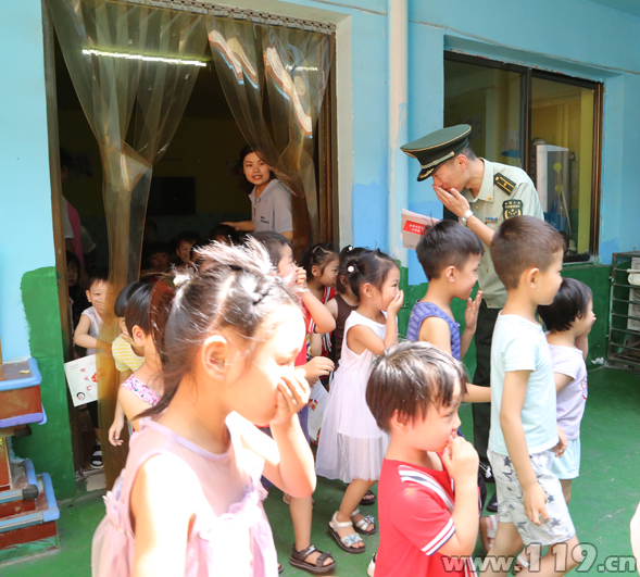 宣讲团走进幼儿园,为小朋友们进行了消防知识培训,详细介绍了火灾的危害性、如何正确拨打报警电话、如何快速火场逃生等消防常识。随后,宣传人员组织全体师生开展火灾应急疏散逃生演练活动。演练模拟一教室发生火灾,火势迅速蔓延,老师发现火情后,立即拨打119报警电话,并迅速启动应急疏散。在各班级老师的有序组织下,所有小朋友捂住口鼻弯腰低姿迅速往最近的安全出口有序的疏散至安全区域。