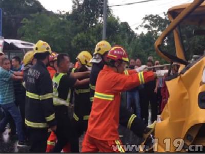 现场是两辆货车追尾相撞,后面卡车的司机被卡在驾驶室内,神志清醒,等待救援。由于撞击猛烈,车头变形严重,驾驶室已经凹陷进去,救援人员将安全绳绑在方向盘上,消防员、民警、以及围观群众一起合力与车头“拔河”,众人齐心协力终于将凹陷的车头拉出,成功将被困人员救出,移交现场急救人员送往医院进一步检查治疗。