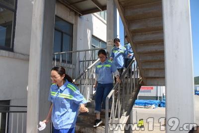 随后,模拟企业宿舍楼三层起火,宿舍楼值班人员发现火情后,立刻通知企业安保部及消防中控室,企业应急救援指挥部根据现场情况迅速启动公司应急救援预案,成立救援队伍赶到现场,并拨打119报警。在值班人员的统一指挥下,企业员工有序弯腰、捂住口鼻,撤离到宿舍楼外安全区域,同时该单位企业消防队利用1台水罐消防车稳住火情。