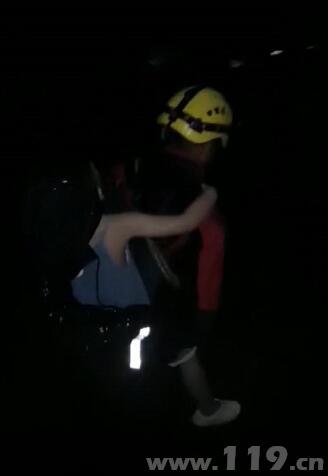 随后,救援人员脱下了身上的雨衣,给四名儿童披在身上,四名救援人员每人背起一个孩子,其余救援人员保护其余女士,开始向山下走去。救援人员一边护着孩子,一边安慰他们不要害怕,汗水和雨水交织把衣服湿透了好几遍,最终,经过近四十分钟的艰难行进,成功将八名被困人员护送下山。