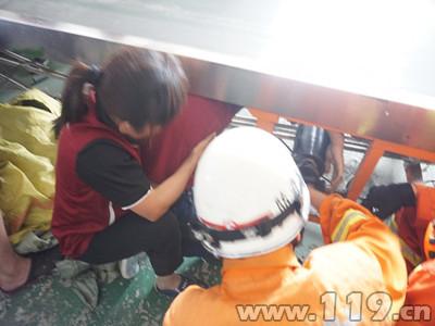 在事发现场,只见快递小哥蹲在快递传输带设备下方,右手臂卡在输送机带转轴内,整个人无法动弹,他的母亲正紧紧将他抱住。快递小哥面色苍白,现场的同事告诉我们,他已经被困在这里有20来分钟了。